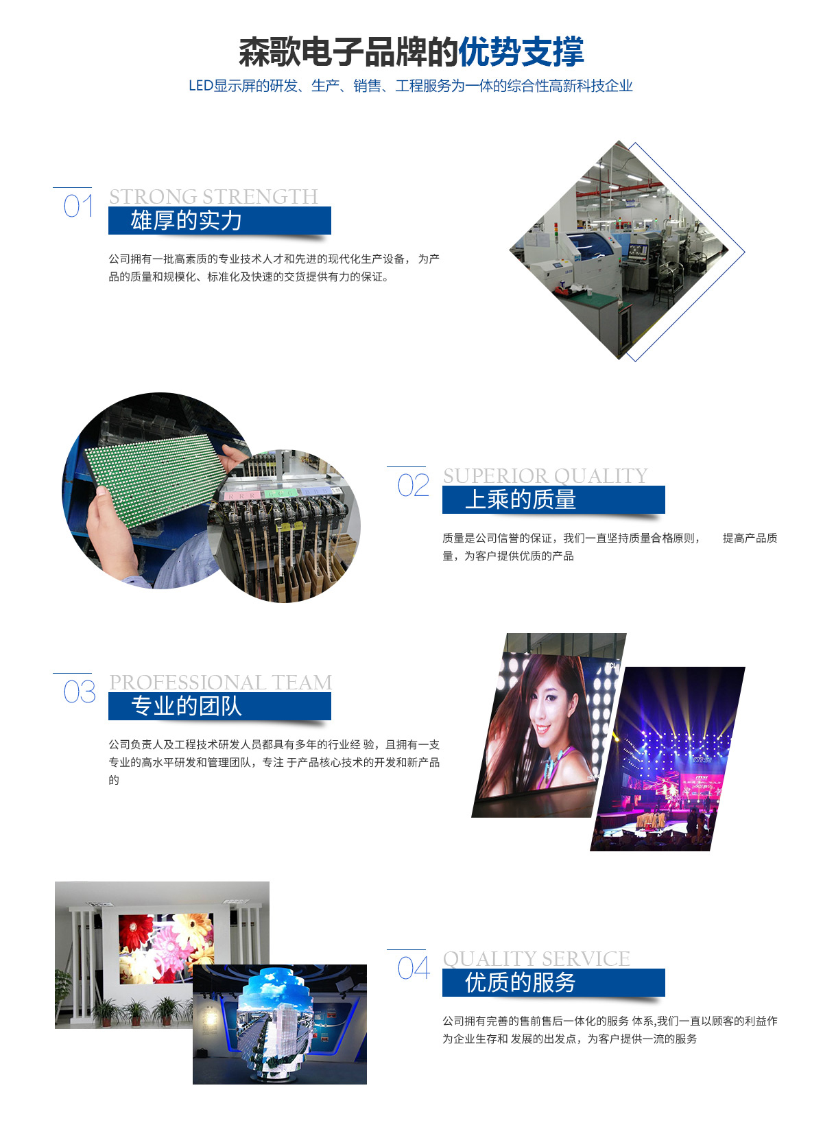 鄭州森歌電子科技有限公司是一家專業(yè)從事LED顯示屏的生產(chǎn)、銷售、工程服務(wù)為一體的高新科技企業(yè)。公司擁有一批高素質(zhì)的專業(yè)技術(shù)人才和先進的現(xiàn)代化生產(chǎn)設(shè)備,公司的主要負責(zé)人及工程技術(shù)研發(fā)人員都具有15年以上的LED行業(yè)經(jīng)驗,擁有一支專業(yè)的高水平研發(fā)和管理團隊,專注于LED核心技術(shù)的開發(fā)和LED新產(chǎn)品的自主創(chuàng)新,為產(chǎn)品的質(zhì)量和規(guī)模化、標準化及快速的交貨提供有力的保證。公司在福建、深圳建立了生產(chǎn)基地。 鄭州森歌電子科技堅持以方案完善,質(zhì)量過硬,服務(wù)及時為口號,堅持走高品質(zhì)路線。現(xiàn)我公司工程業(yè)績已遍布省內(nèi)外,并且在政府機構(gòu)、軍事指揮、銀行系統(tǒng)、醫(yī)療教育、室內(nèi)外廣告、酒店會所、公安指揮調(diào)度、水利工程、視頻會議等多個行業(yè)領(lǐng)域得到廣泛應(yīng)用并獲得客戶的一致好評和普遍認可,是客戶值得信賴的長期戰(zhàn)略合作伙伴。